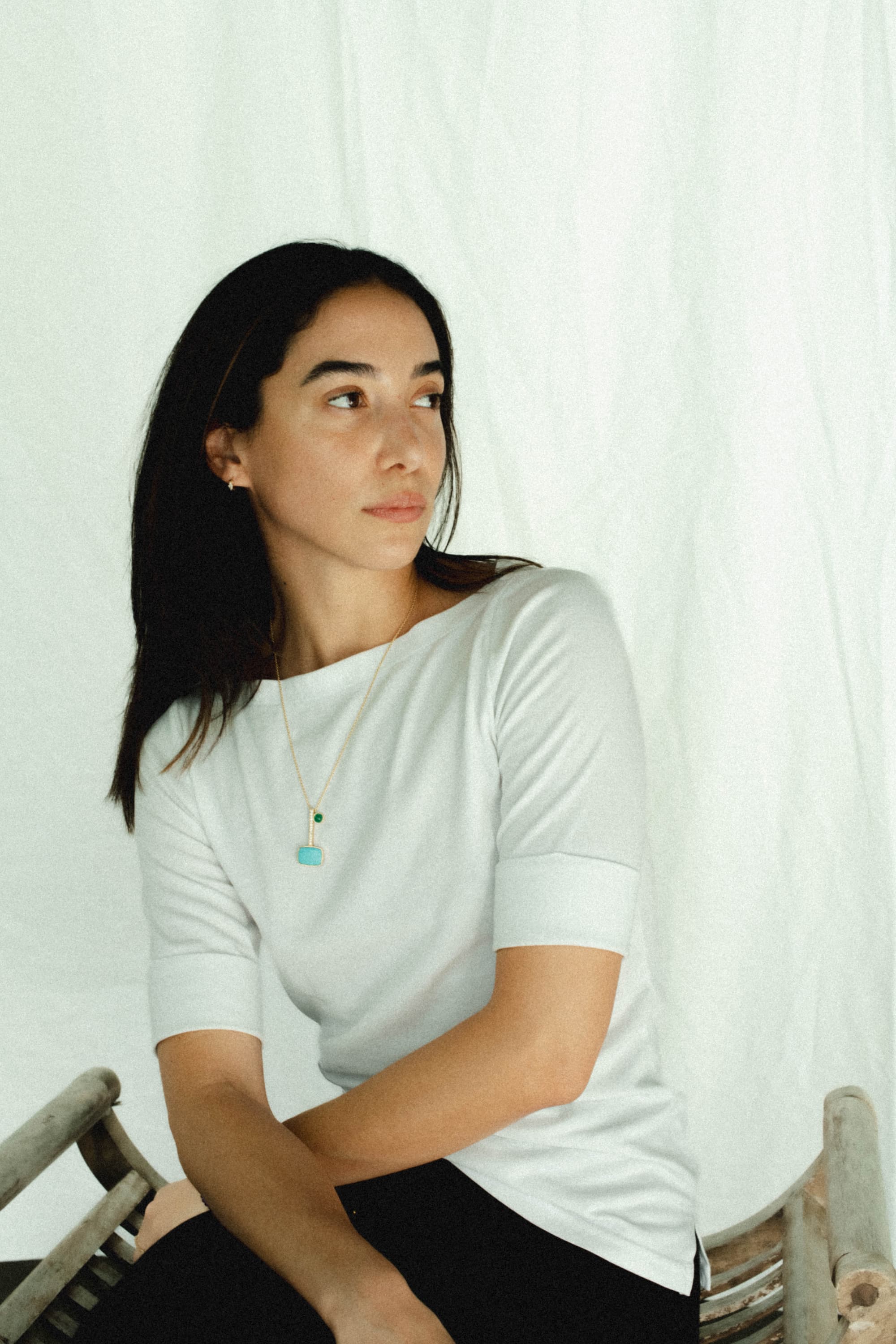 Isabella Soto wearing Clé N.4, crafted with Diamonds, Emerald and Sleeping Beauty turquoise.