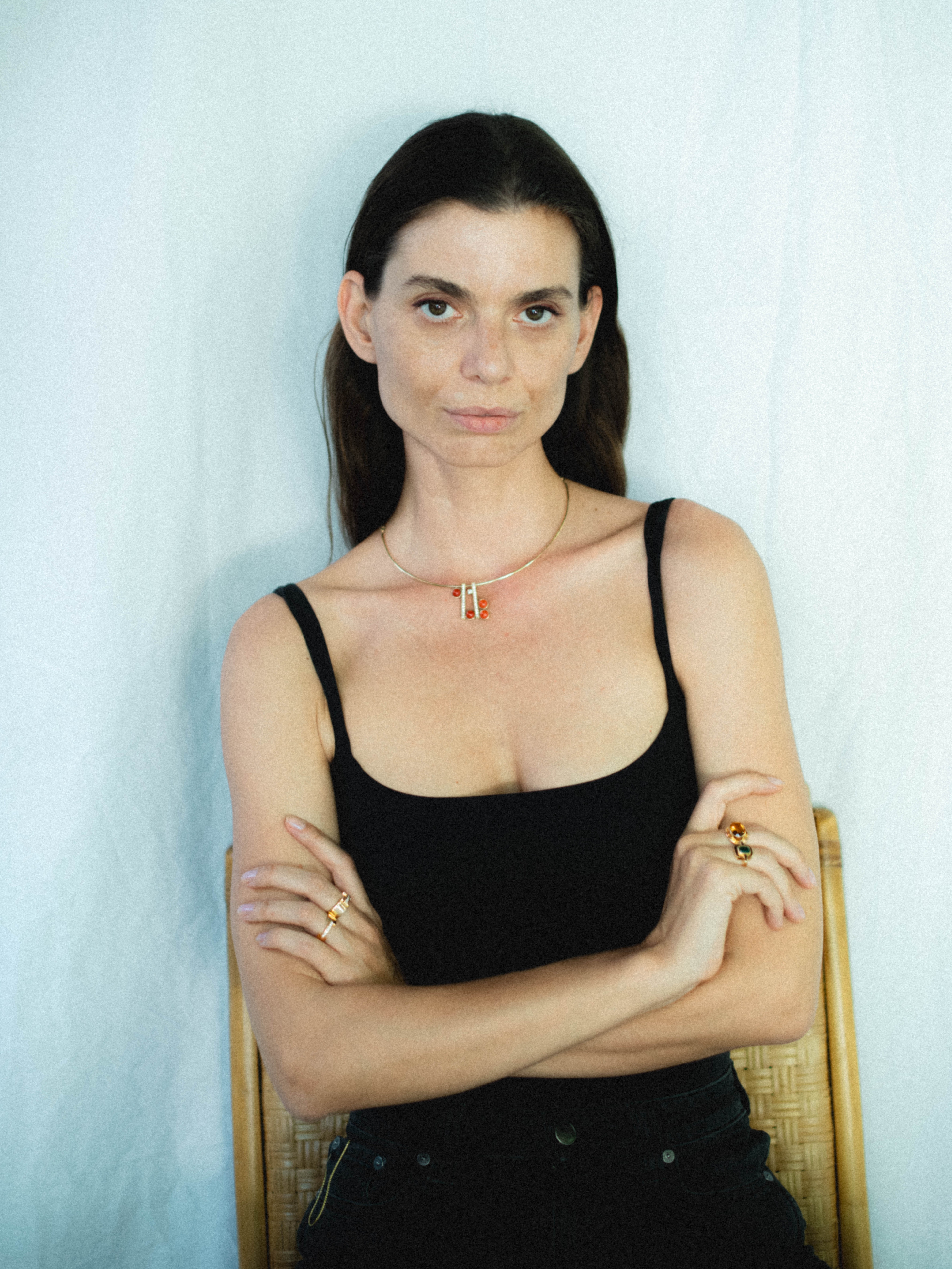 Brigitte Bourgoignie wearing Clé N.7 Smoked, crafted with Quartz, yellow Sapphires and Coral cabochon.