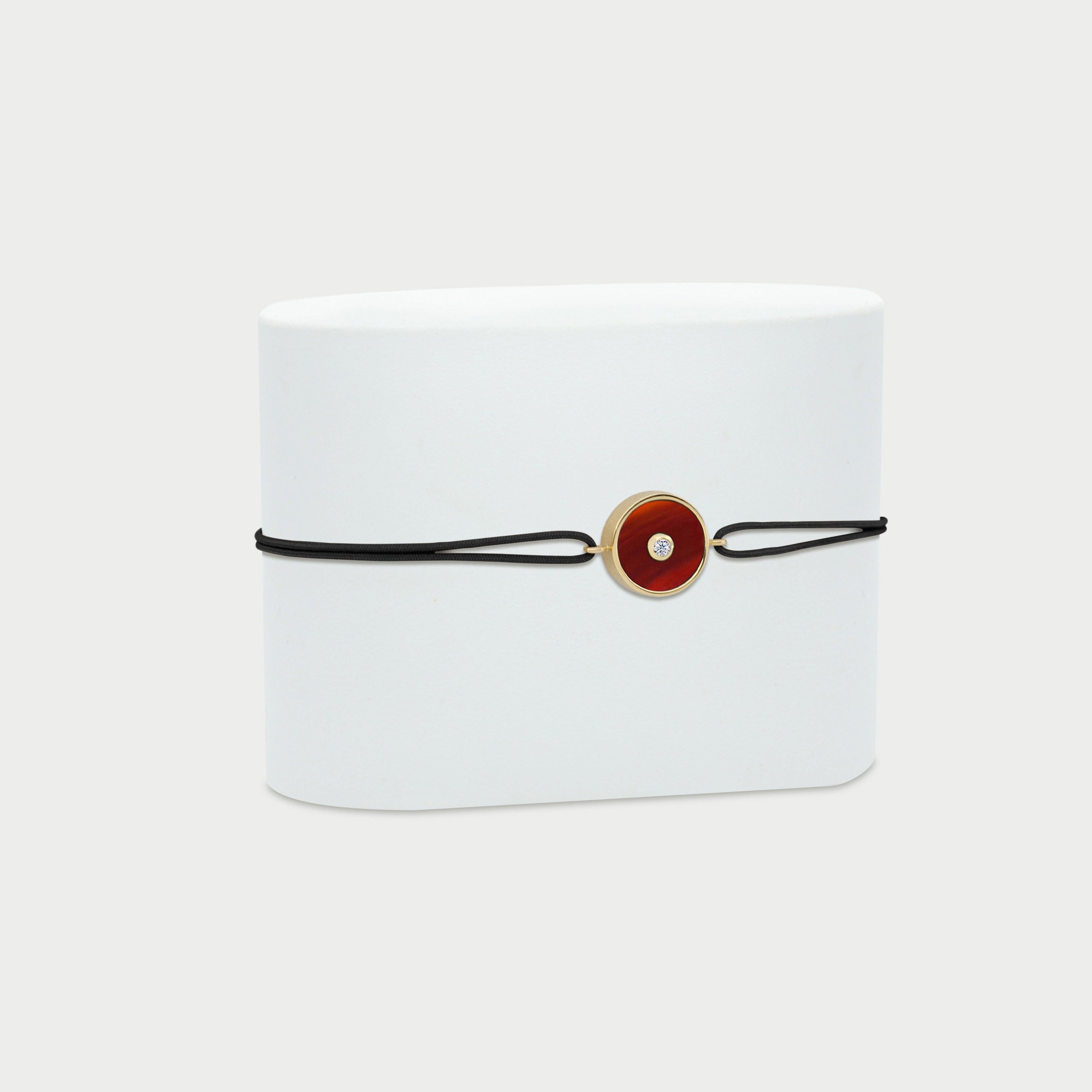 The Bracelet N.1 with Carnelian brings you the strength and creativity power of the "sunset stone" in an elegant manner. Designed as a unisex, adjustable cord bracelet, it features a fiery Carnelian disk set in 14K Yellow Gold and embellished with a Diamond nested at its center.
