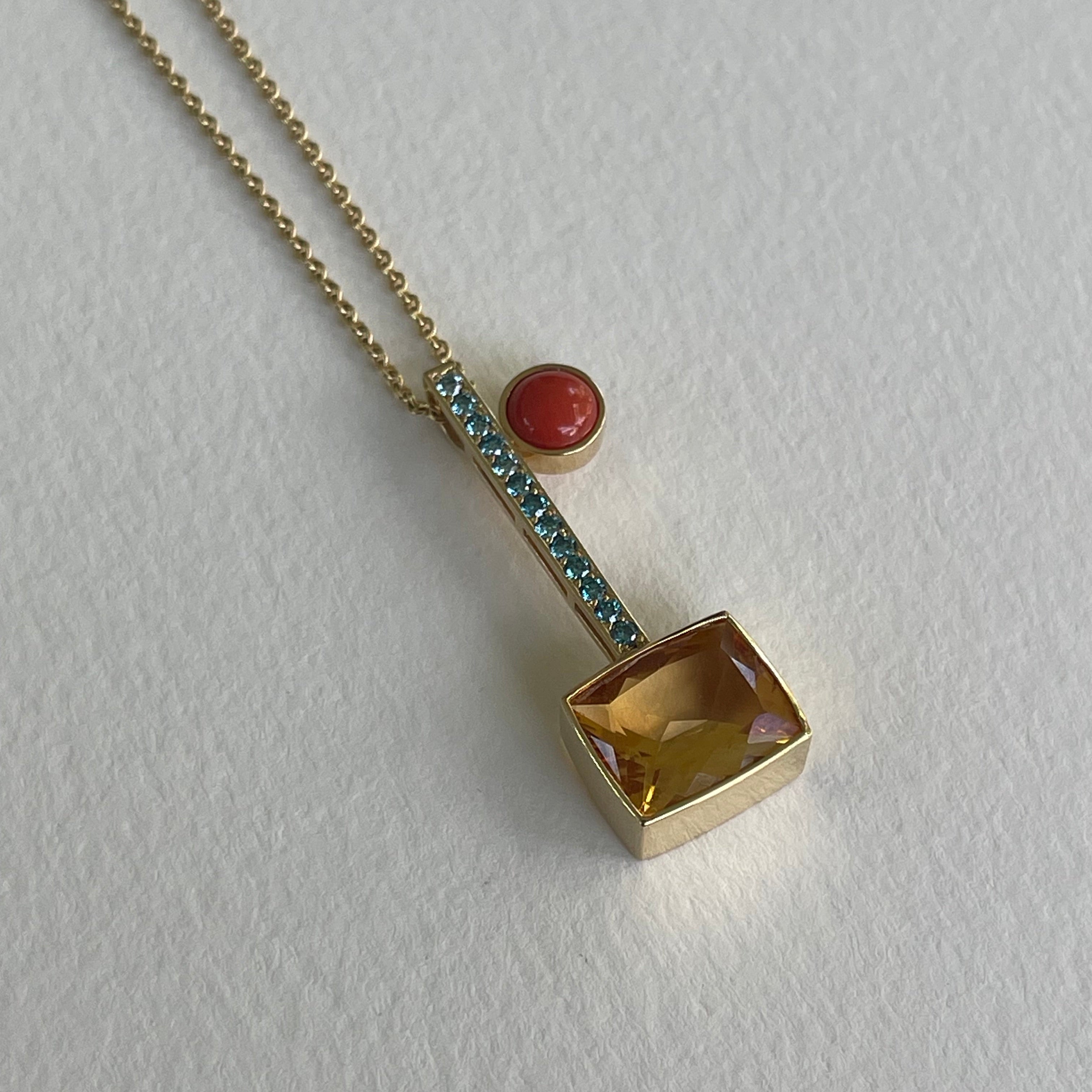 18K Yellow Gold necklace with Citrine, Blue Diamonds and Coral cabochon,