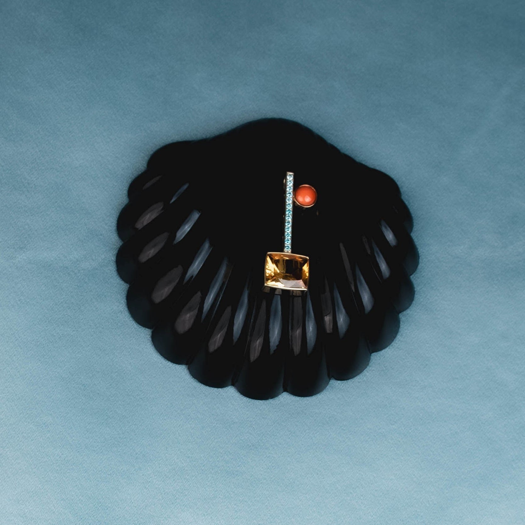 A sculptural play of geometry and color, Clé N.2 balances the warmth of citrine with the cool brilliance of blue diamonds, lifted by the vibrant presence of a coral cabochon. Mounted in 18K gold in our Miami atelier, it becomes an intimate invitation to embrace clarity, energy, and intentional design. The pendant can also be worn with our Essential Collar.