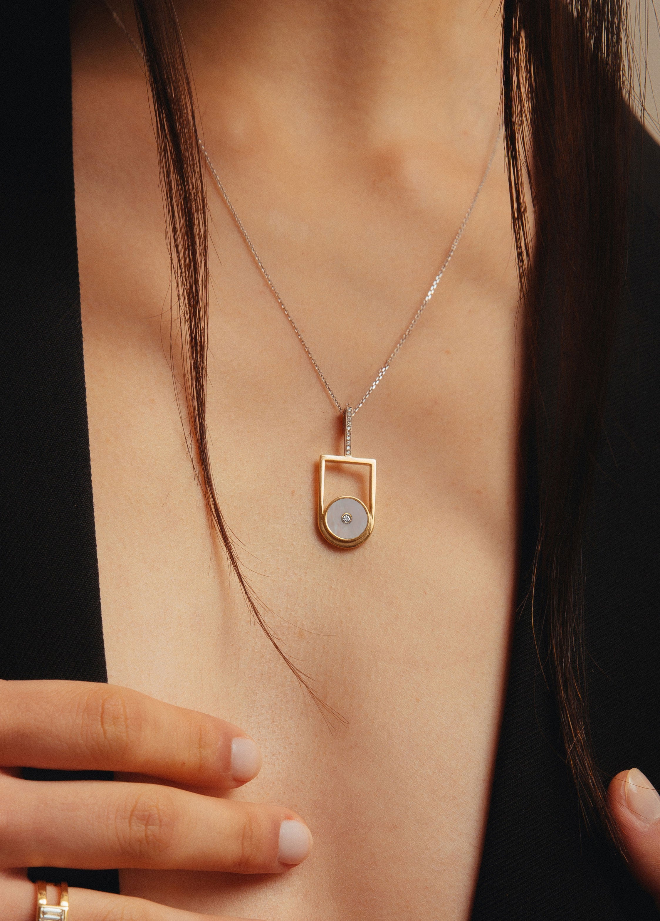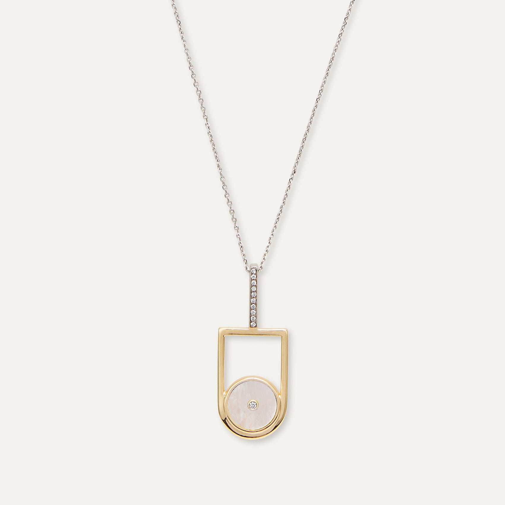 Think classic elegance translated in a modern way. Crafted in the iconic Yellow and white Gold blend of its time, the Art Deco necklace boasts a distinctive interplay of geometric shapes, adorned with Mother of Pearl and Diamonds. It is the sophisticated addition to any occasion.