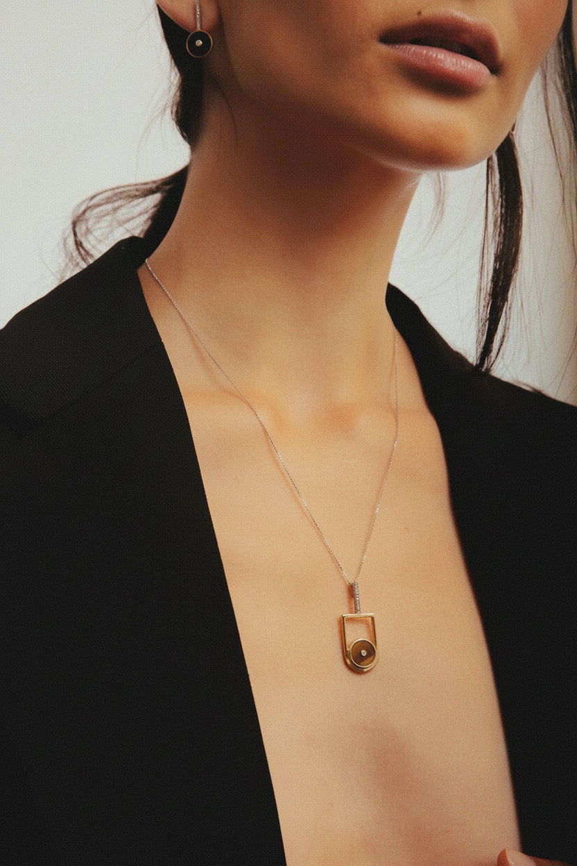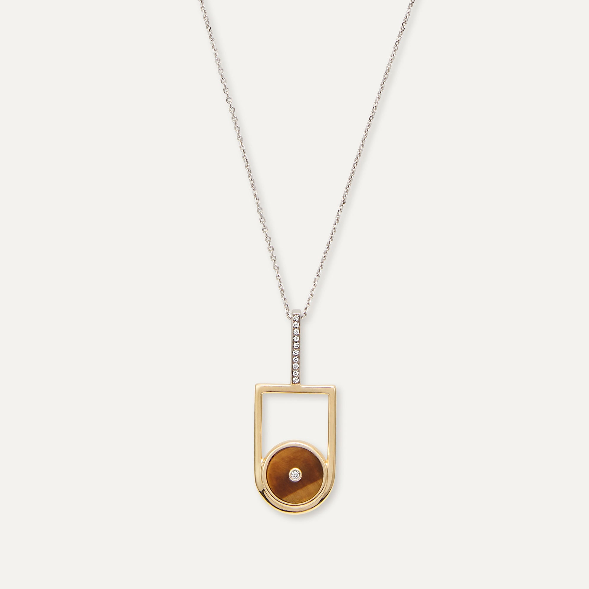 Think classic elegance translated in a modern way. Crafted in the iconic Yellow and white Gold blend of its time, the Art Deco necklace boasts a distinctive interplay of geometric shapes, adorned with Tiger Eye and Diamonds. It is the sophisticated addition to any occasion.