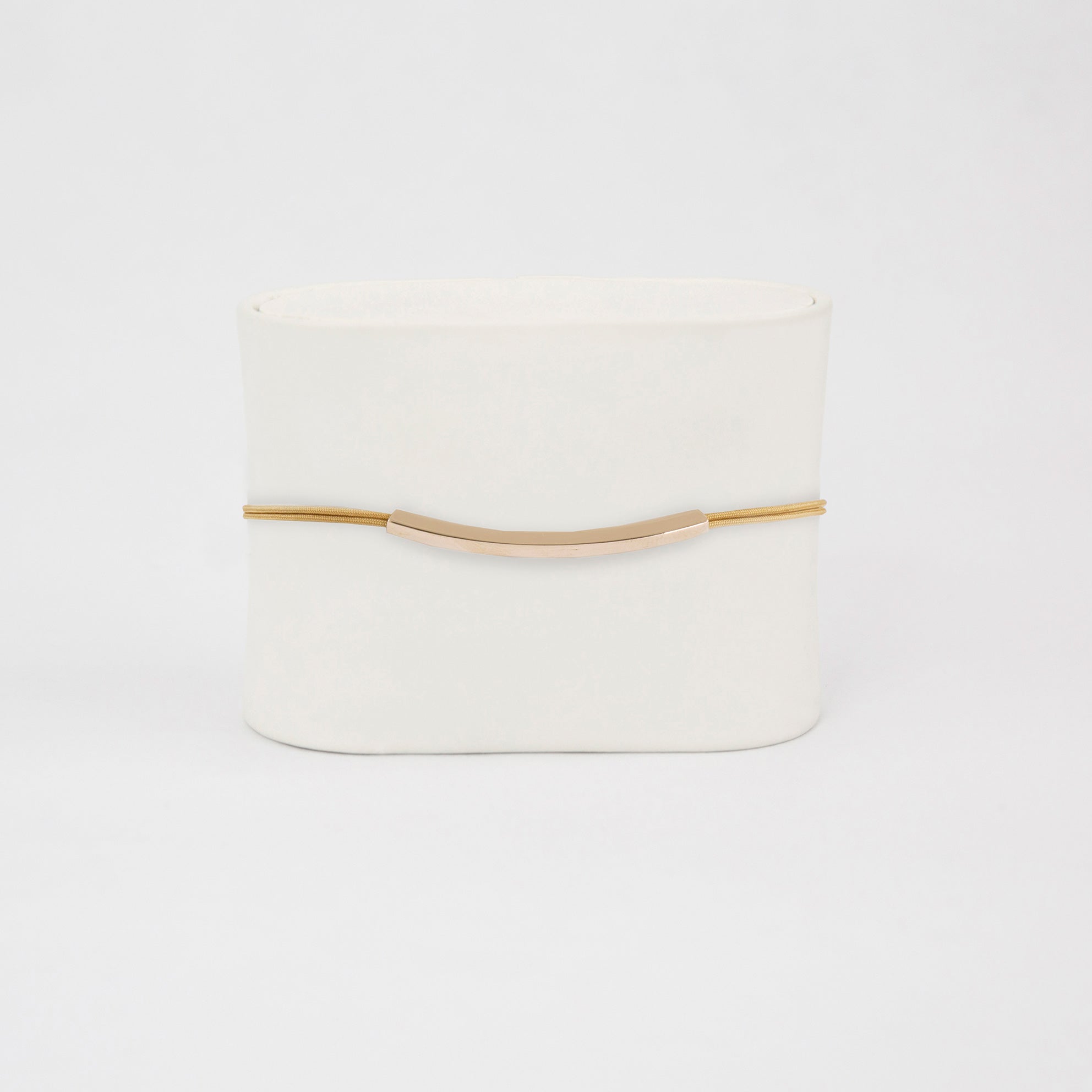 14K Yellow Gold long curved cylinder, adjustable cord bracelet.