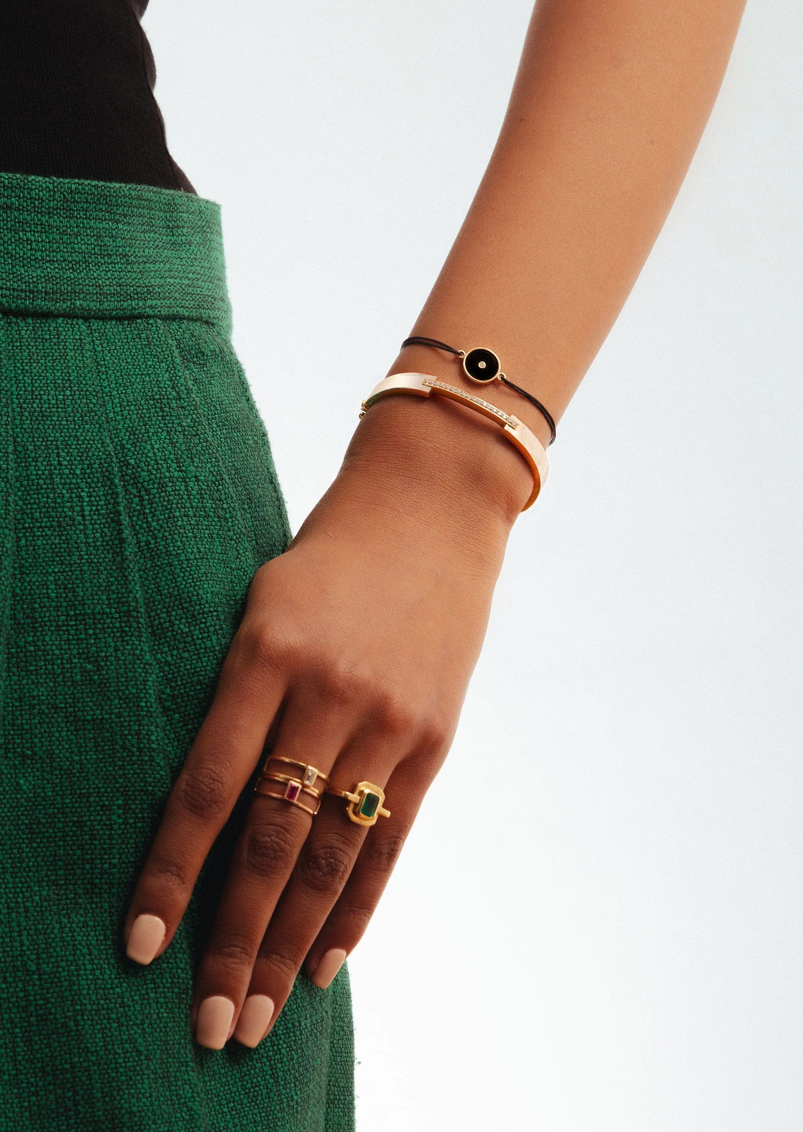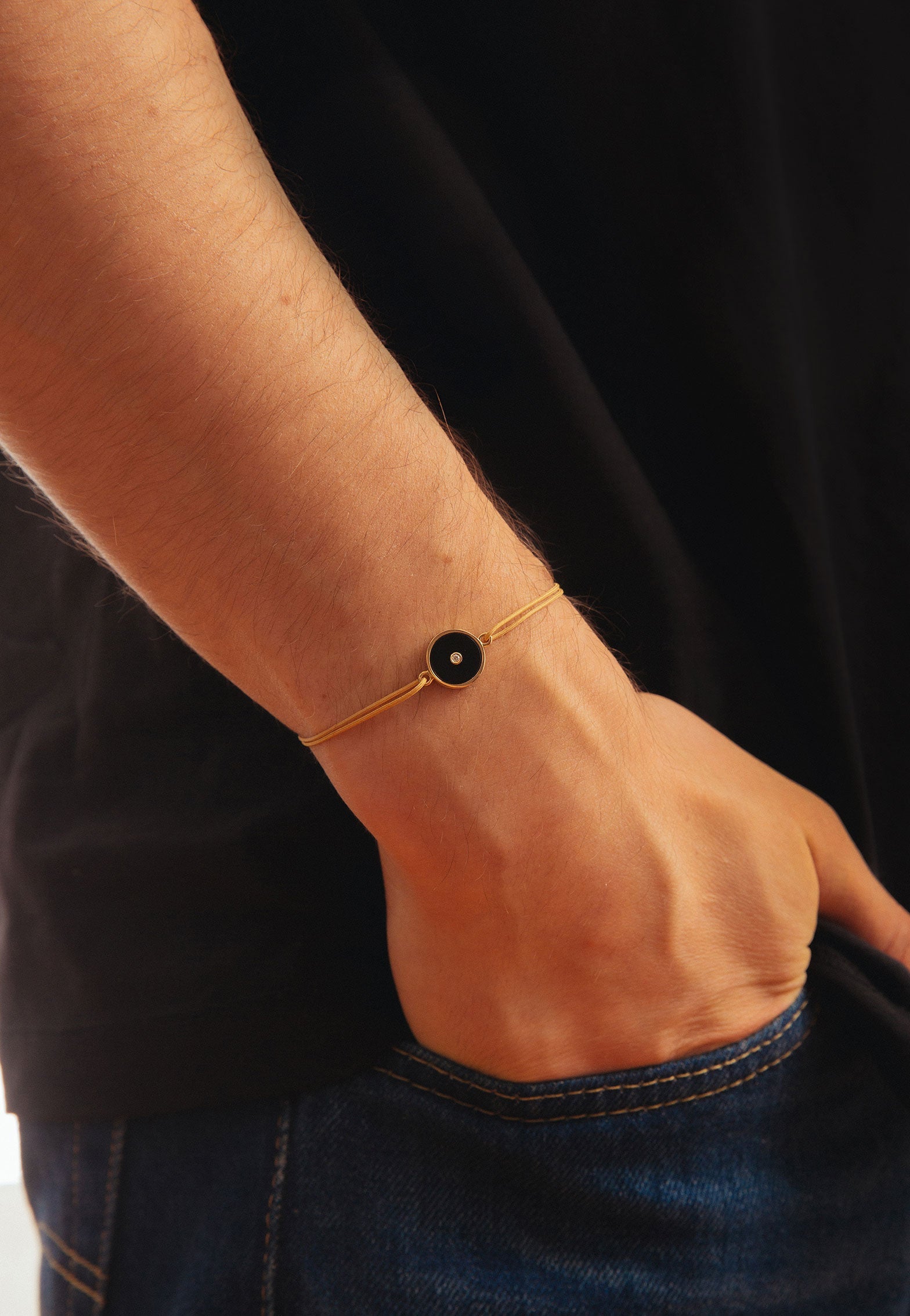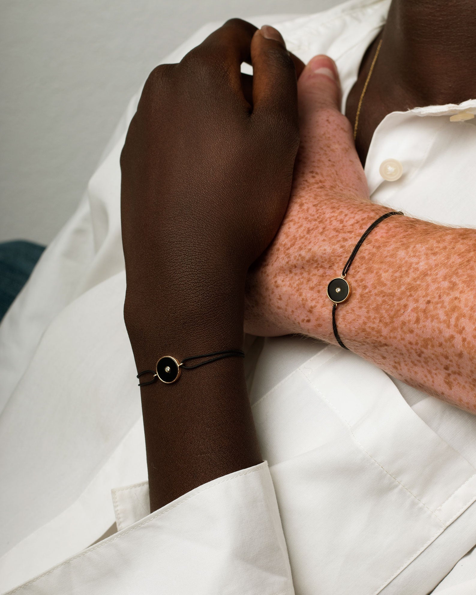 The original Bracelet N.1, debuted in 2015, combines Onyx with Yellow Gold, adorned with an inset Diamond, evoking the timeless aesthetics of the Art Déco era. Unisex and adjustable, this cord bracelet offers a casual yet sophisticated allure while bringing you the protective power and self confidence of Onyx.