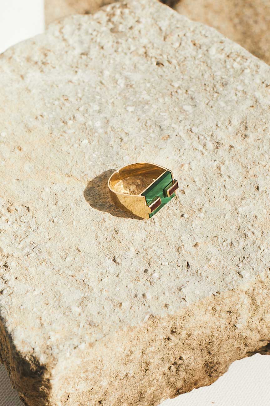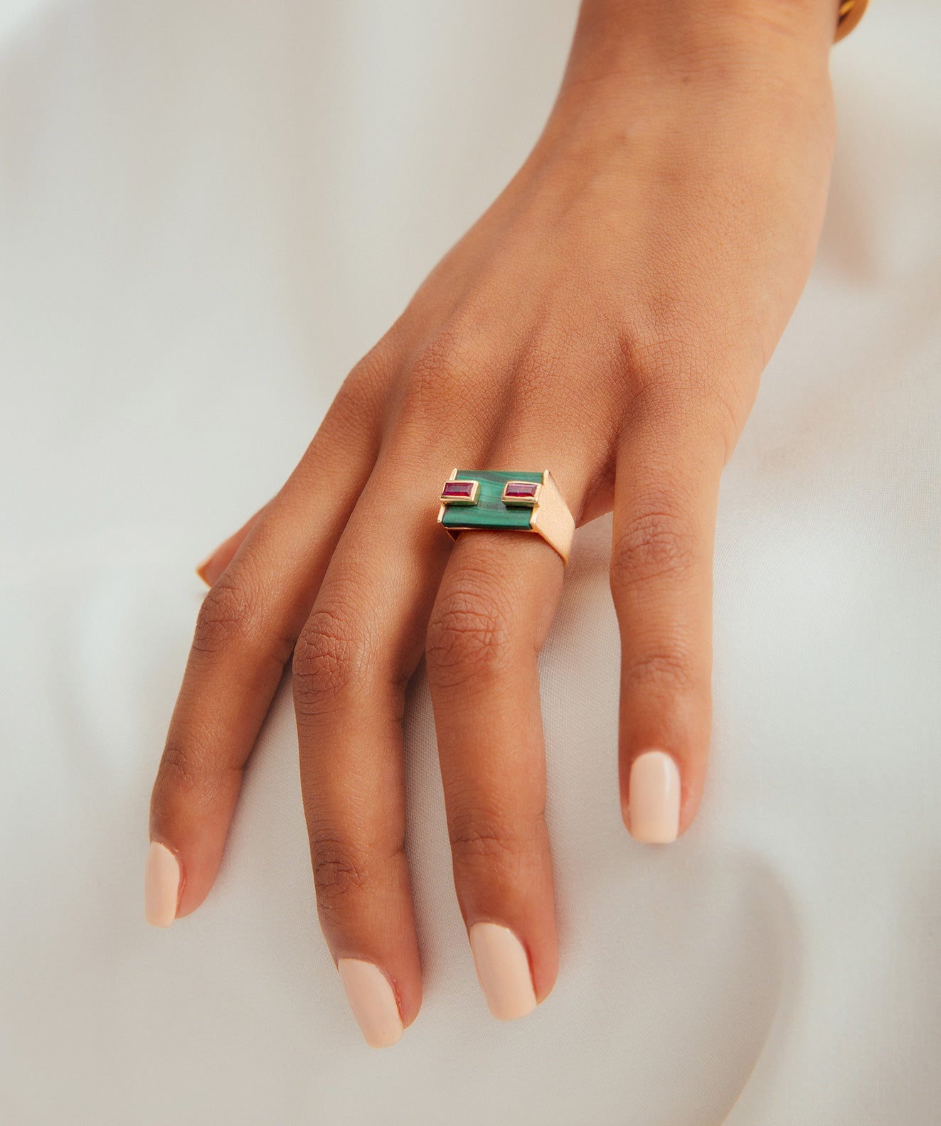 Inspired by the iconic tank rings of the 1940s, the Milestone 1 ring merges our love for sleek, architectural lines and unique stone pairings. In this statement piece, the deep green of Malachite is enhanced by vibrant baguette-cut Rubies and Yellow Gold, creating a luscious color palette.