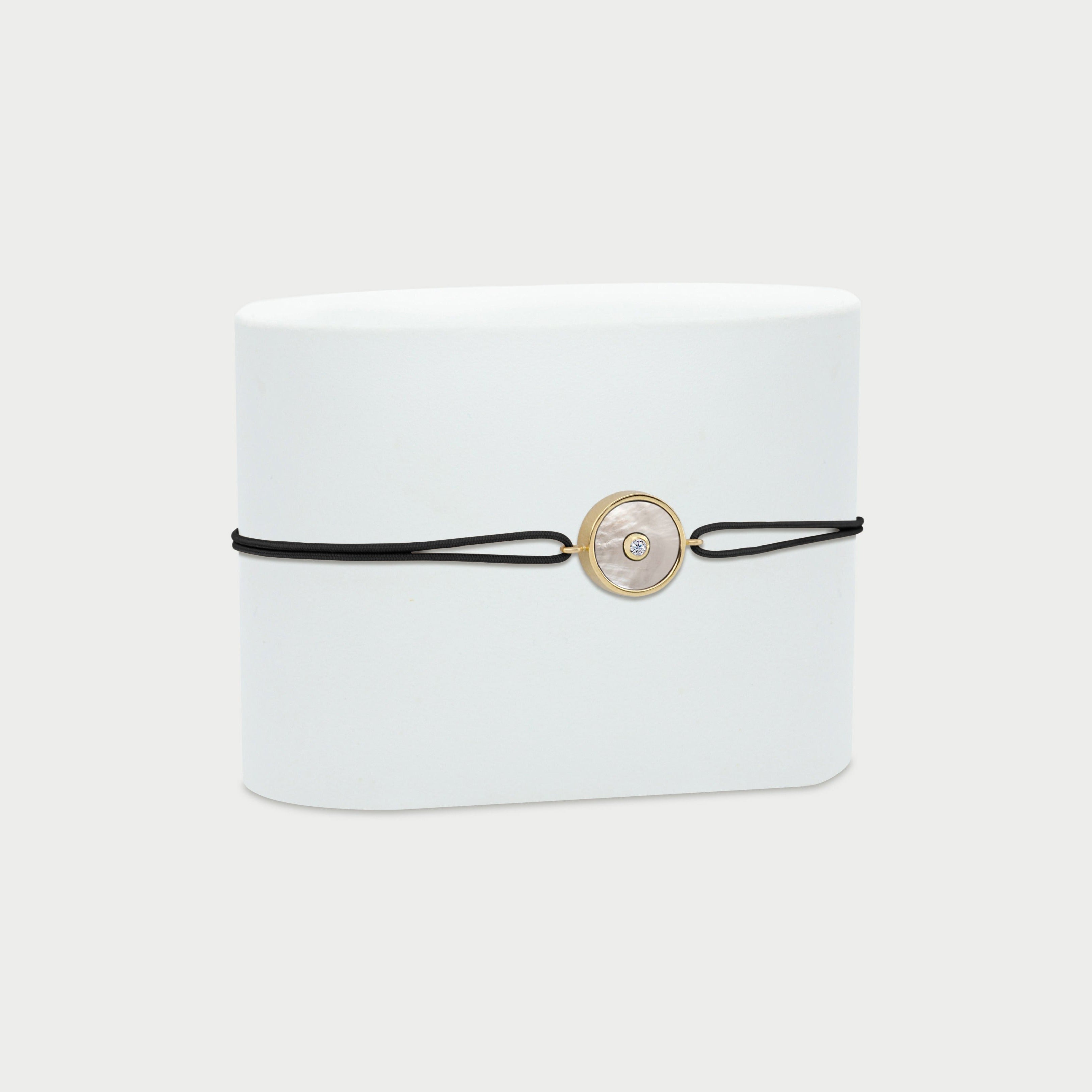 The Bracelet N.1 with Mother Of Pearl celebrates the grace and wisdom associated with this natural symbol of femininity. Set in 14K Yellow Gold and embellished with a Diamond nested at its center, this adjustable bracelet is pure light.