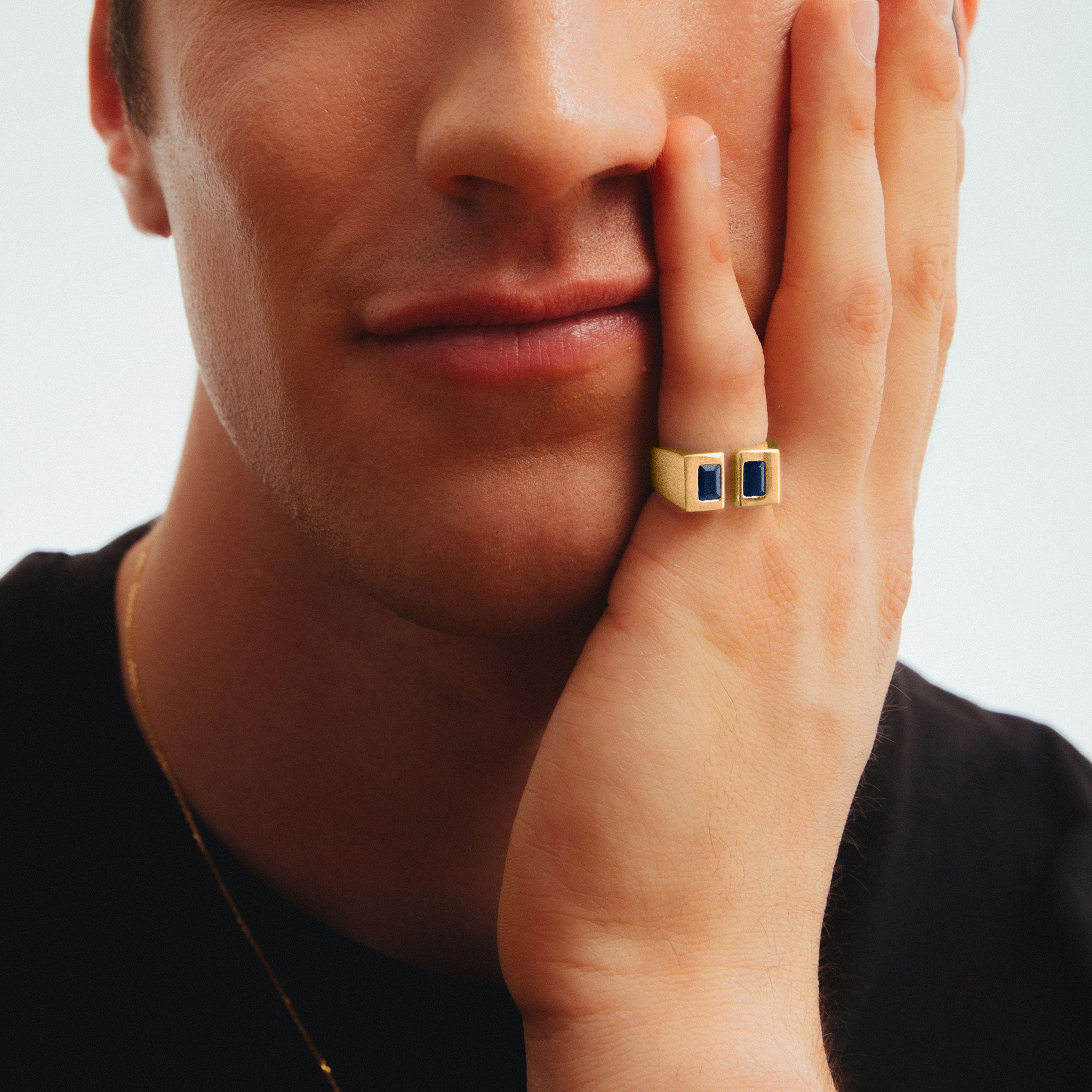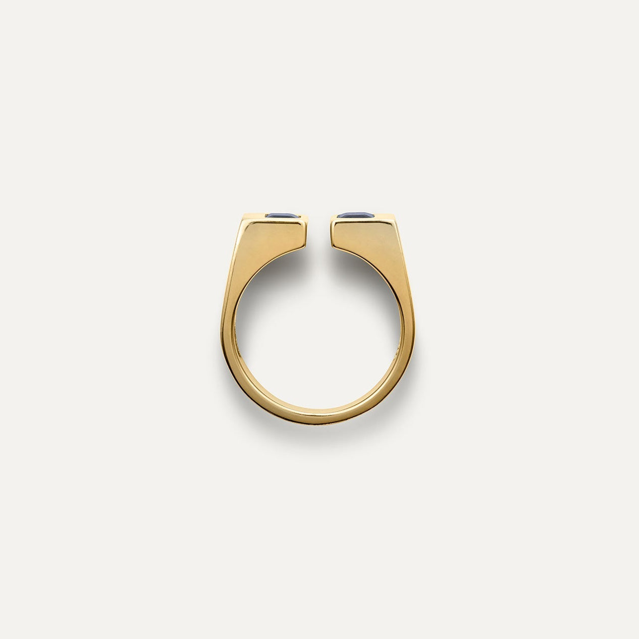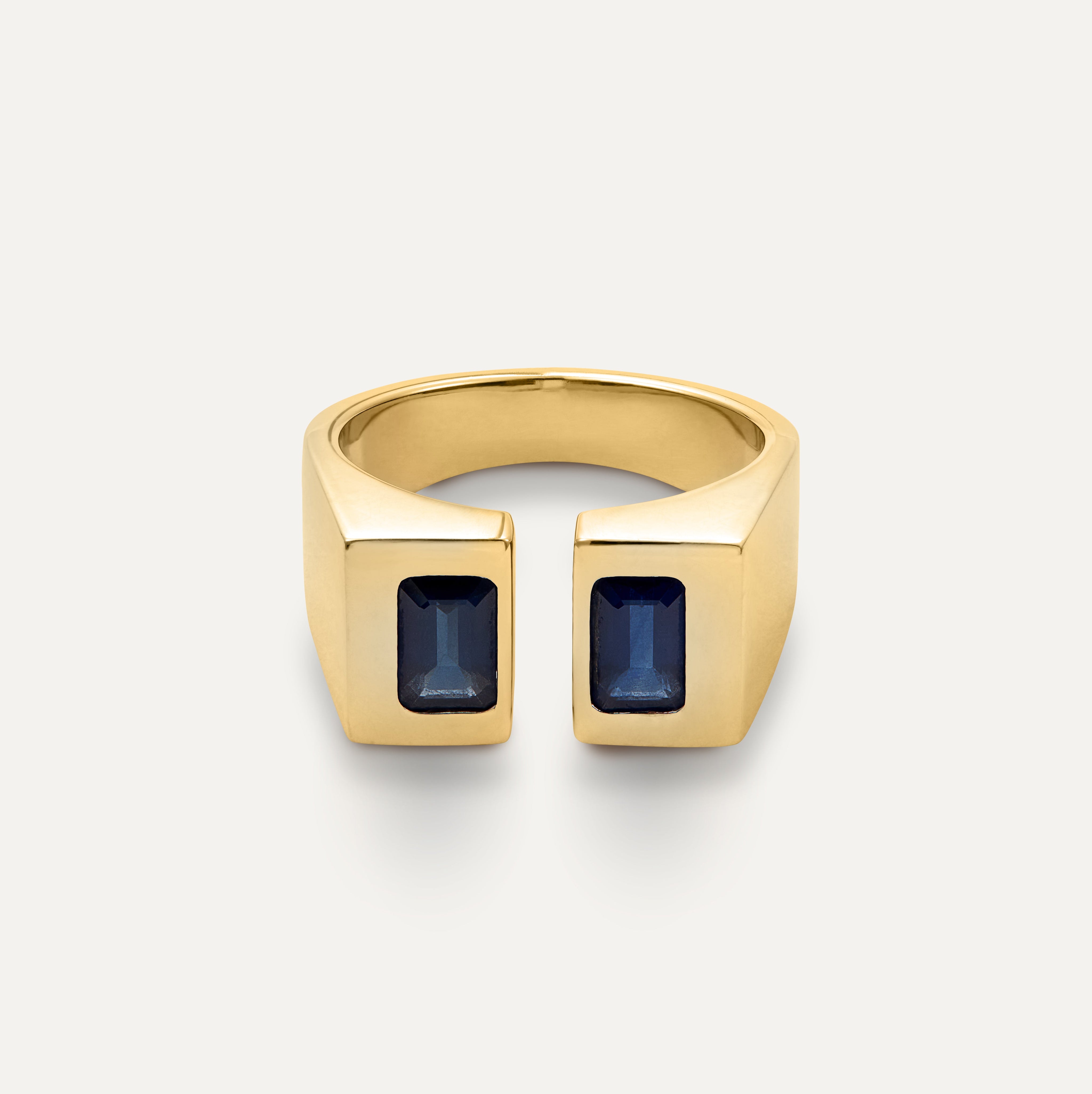 A modern take on the romantic Toi & Moi rings from the 18th century, our ring showcases a pair of emerald-cut sapphires set in 14K Yellow Gold. Its architectural profile, streamlined lines, and substantial thickness make it a statement piece in both form and meaning.